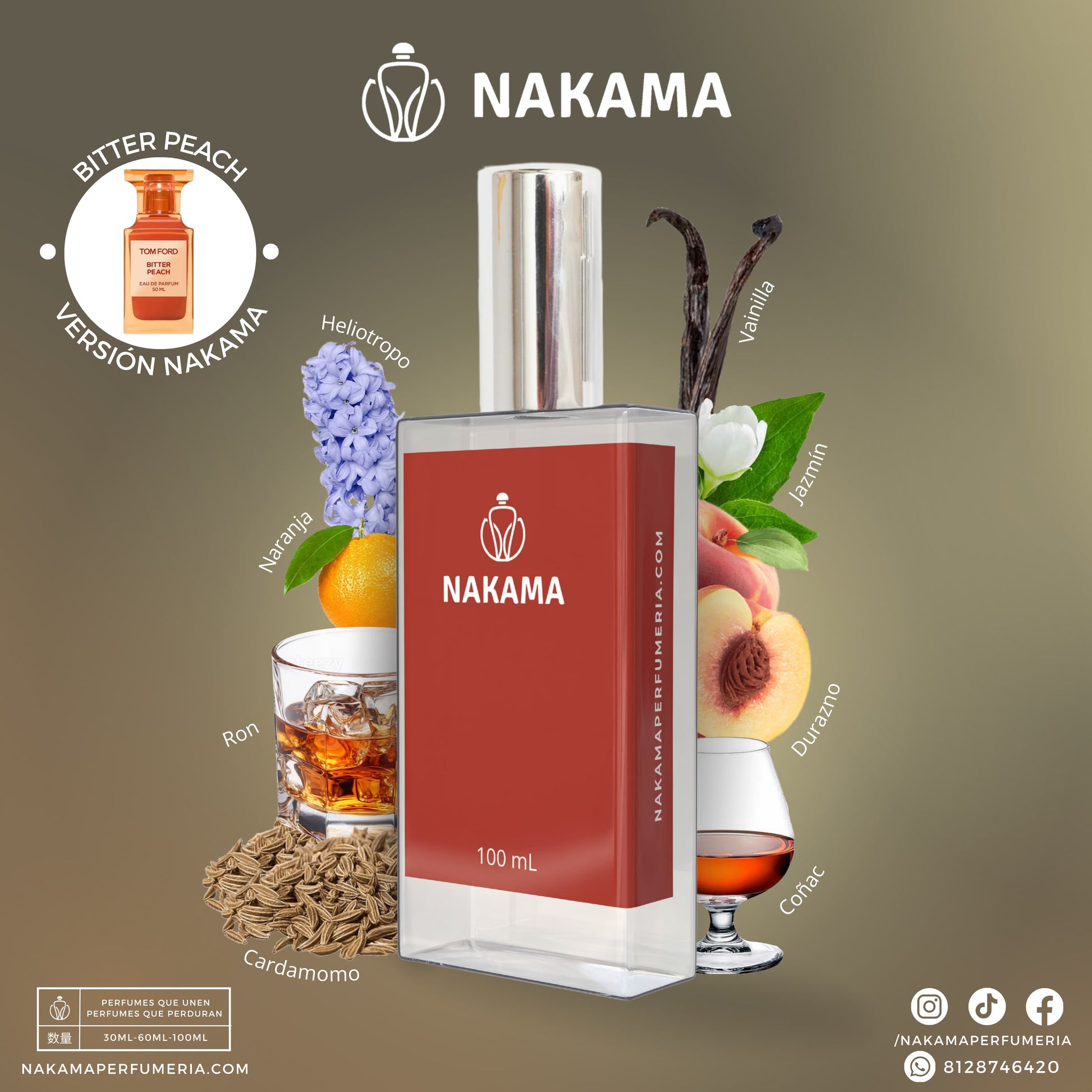 Las fragancias que compras en Nakama Perfumería comparten la misma familia olfativa de perfumes conocidos comercialmente estos se pueden mencionar de manera informativa debido a que sus notas se ubican en la misma familia olfativa dentro de las genealogías mundiales de perfumería. Este documento sólo tiene fines informativos de comparación para el público consumidor en los términos establecidos por el artículo 32 de la Ley Federal de Protección al Consumidor, sin perjuicio de lo establecido por el Artículo 173 fracciones X y XV