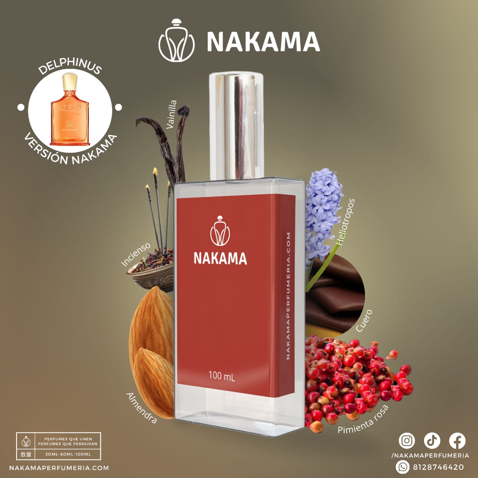 Las fragancias que compras en Nakama Perfumería comparten la misma familia olfativa de perfumes conocidos comercialmente estos se pueden mencionar de manera informativa debido a que sus notas se ubican en la misma familia olfativa dentro de las genealogías mundiales de perfumería. Este documento sólo tiene fines informativos de comparación para el público consumidor en los términos establecidos por el artículo 32 de la Ley Federal de Protección al Consumidor, sin perjuicio de lo establecido por el Artículo 173 fracciones X y XV